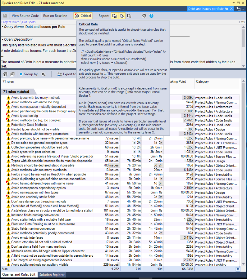 The new version of NDepend introduces two new concepts: a technical-debt and an annual-interest. Now all reported problems has those two additional metrics. The technical-dept tells us how much time we need to spend to fix a reported issue. It may vary from minutes to days. On the other hand an annual-interest warn us how much time per year we will need to maintain this problem if we won’t fix it. It sounds simple, but it’s extremely useful.